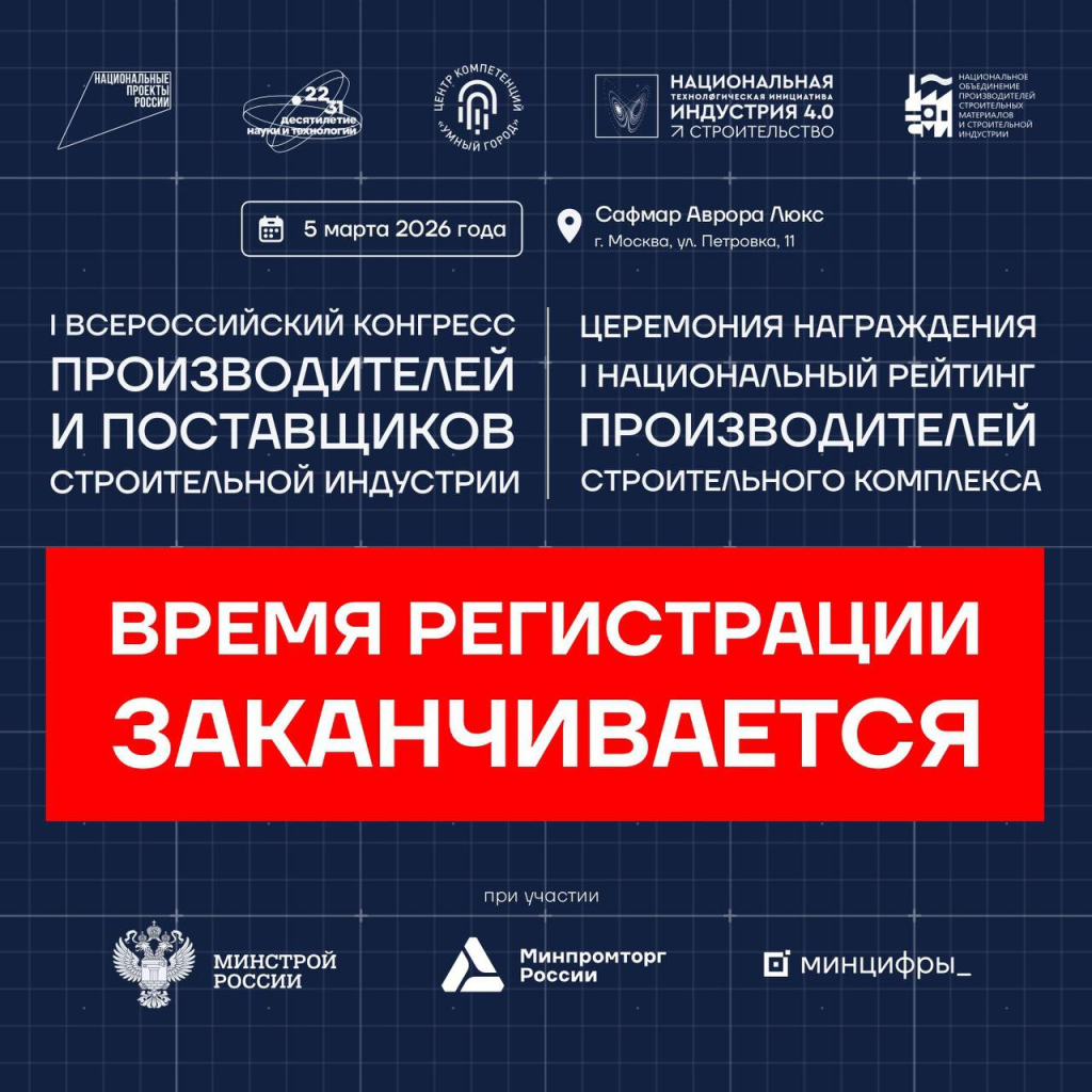 📅 5 марта в Москве состоится I Всероссийский конгресс производителей и поставщиков строительной индустрии. Мероприятие — рабочая площадка для формирования и дополнения ведущими застройщиками и генподрядчиками страны пулов подрядчиков до начала тендерного сезона.