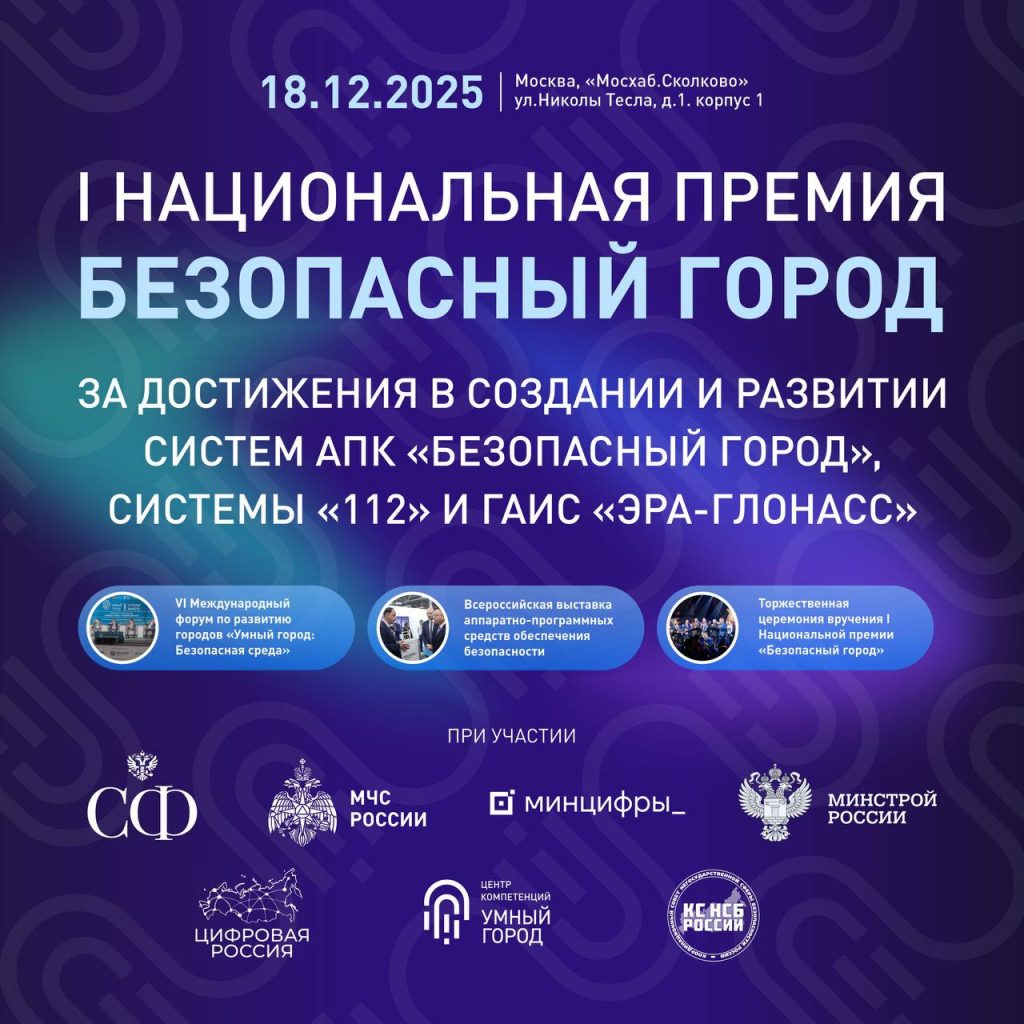 • Церемония награждения лауреатов I Национальной Премии «Безопасный город» — признание лучших регионов, муниципалитетов, проектов и компаний, формирующих стандарты безопасной и современной городской среды.